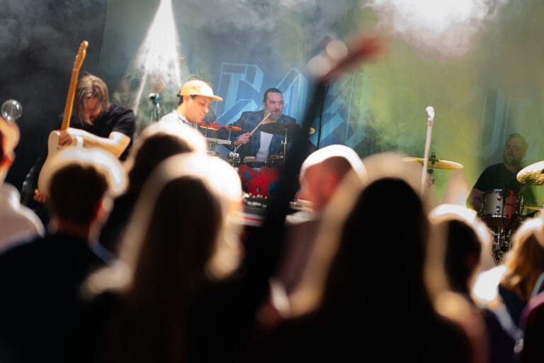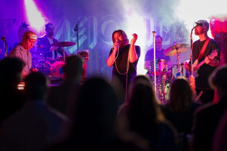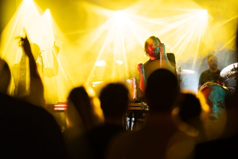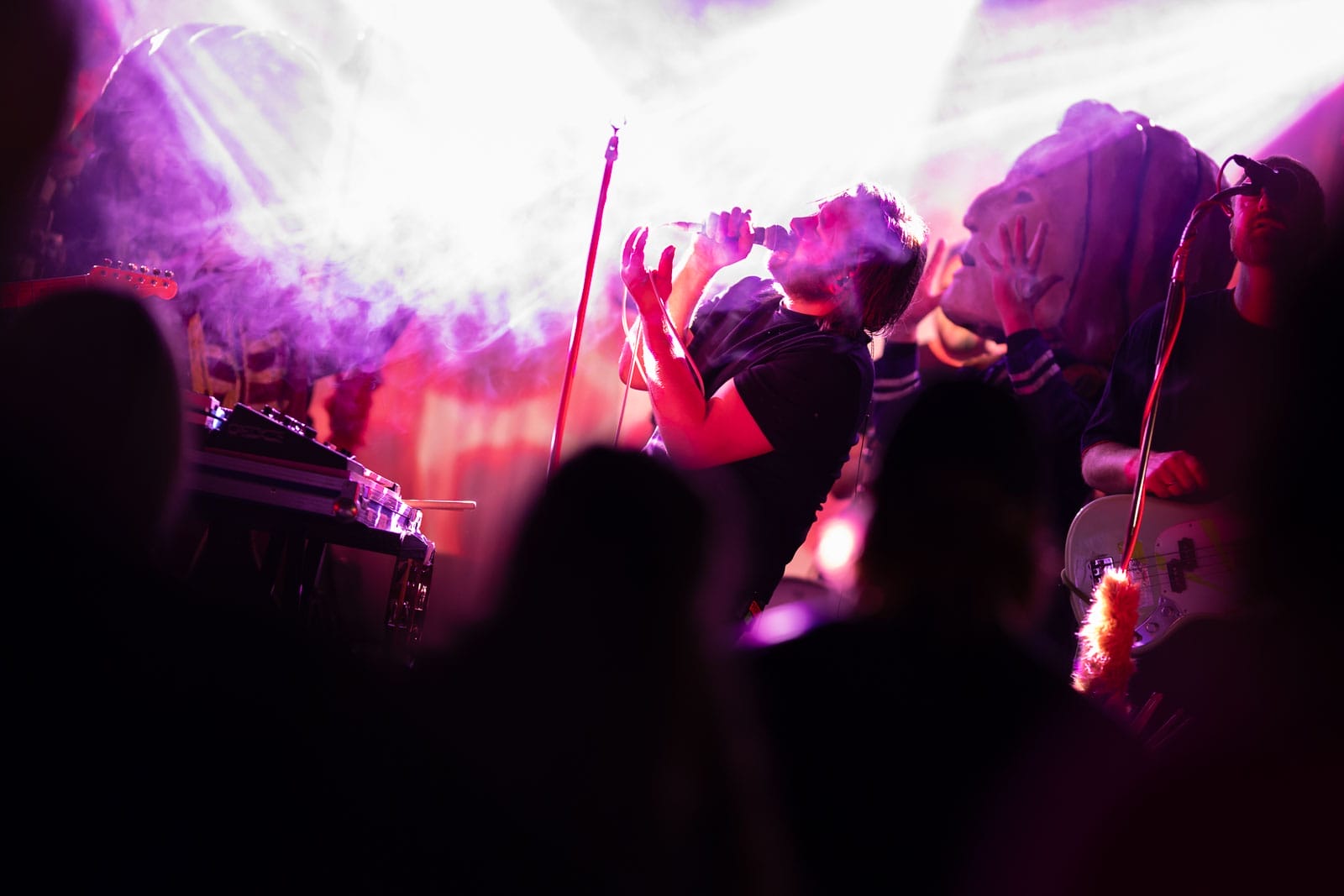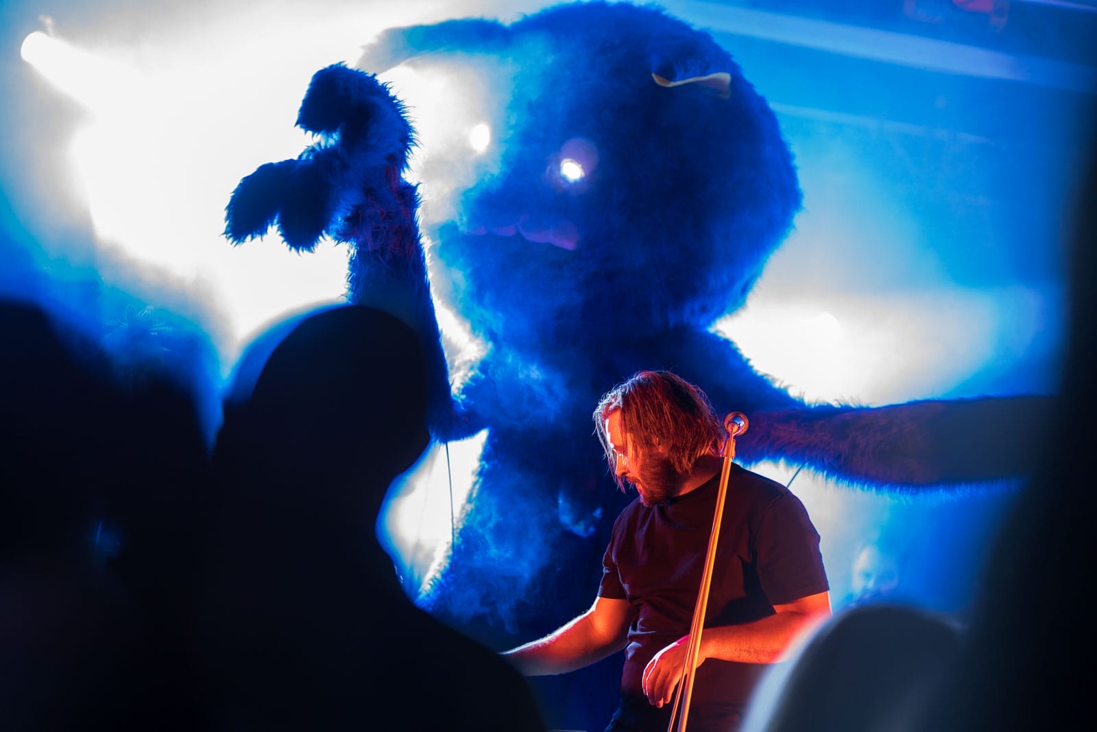 Bandet hadde med seg ulike figurer på scenen – halvt dansere, halvt karakterer fra en absurd drøm. Noen i pels og noen i kjempestore masker! Vi var nesten i tvil om den største dukken skulle få plass, men jammen gikk det!